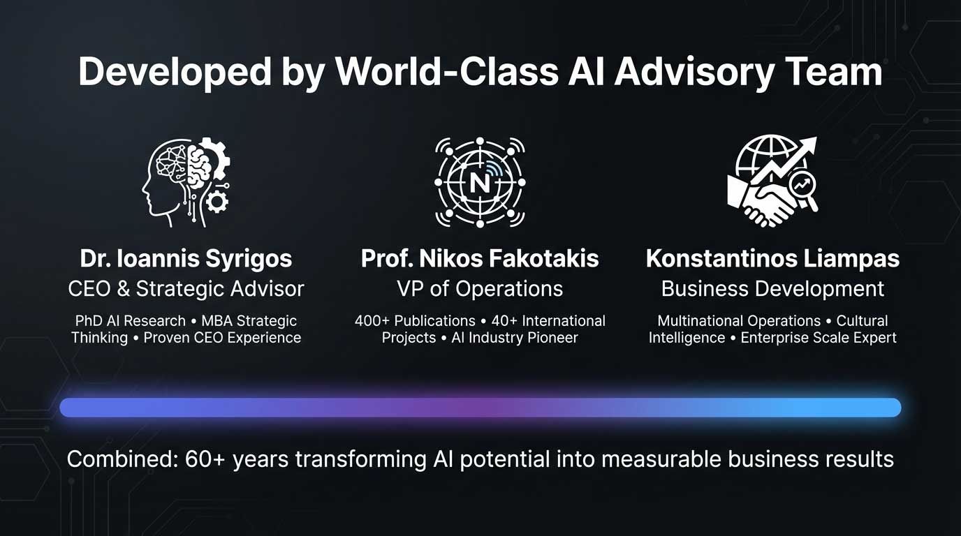 Our AI Maturity Matrix and Value Bridge Framework are exclusive methodologiesĀ developed by our advisory team, combining PhD-level AI research, 400+ scientific publications, MBA strategic thinking, and decades of multinational operations experience.Ā